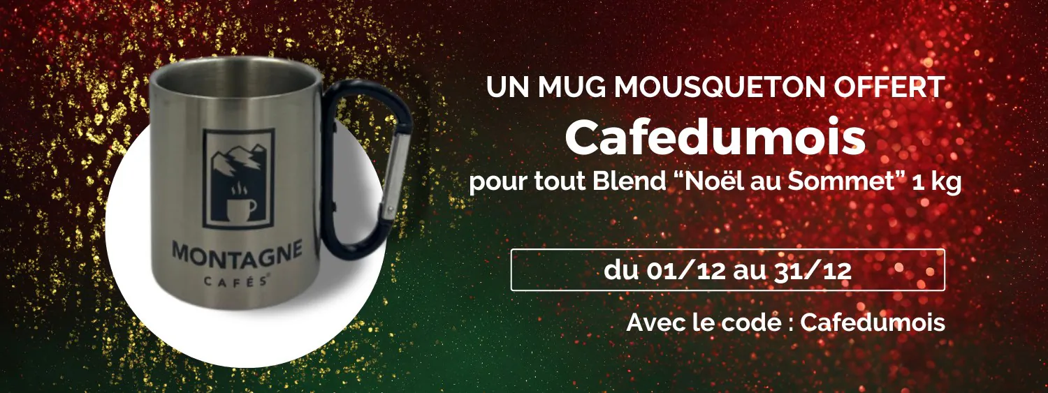 Offre décembre : un mug mousqueton offert pour tout achat de notre "Blend de Noël" en format 1 kg avec le code Cafedumois